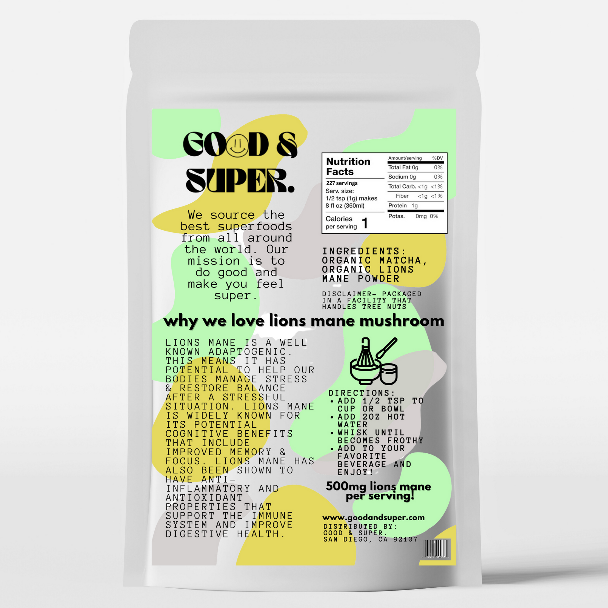 The best part about our Good & Super Organic Mushy Matcha Powder is the fact that you are getting 2 for 1 health benefits. The combination of matcha and lions mane mushroom yields a unique combination of beneficial compounds like L-Theanine, amino acids, GABA, beta-glucans, etc. Both Lions Mane Mushroom and matcha are known to be anti-oxidant and anti-inflammatory powerhouses that can support the immune system.